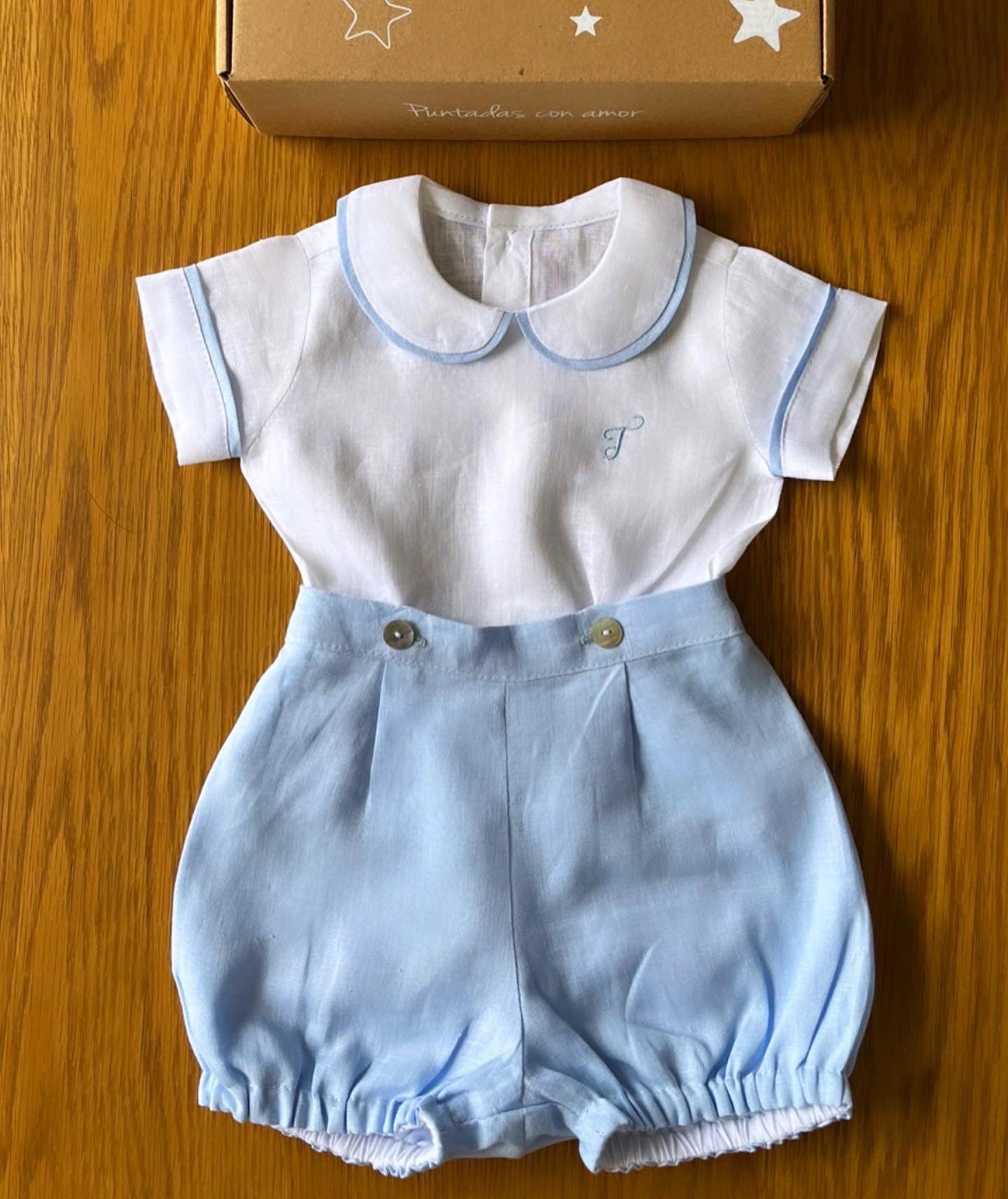 Camisa y short en lino olán, este diseño se personaliza con la inicial del nombre del niño