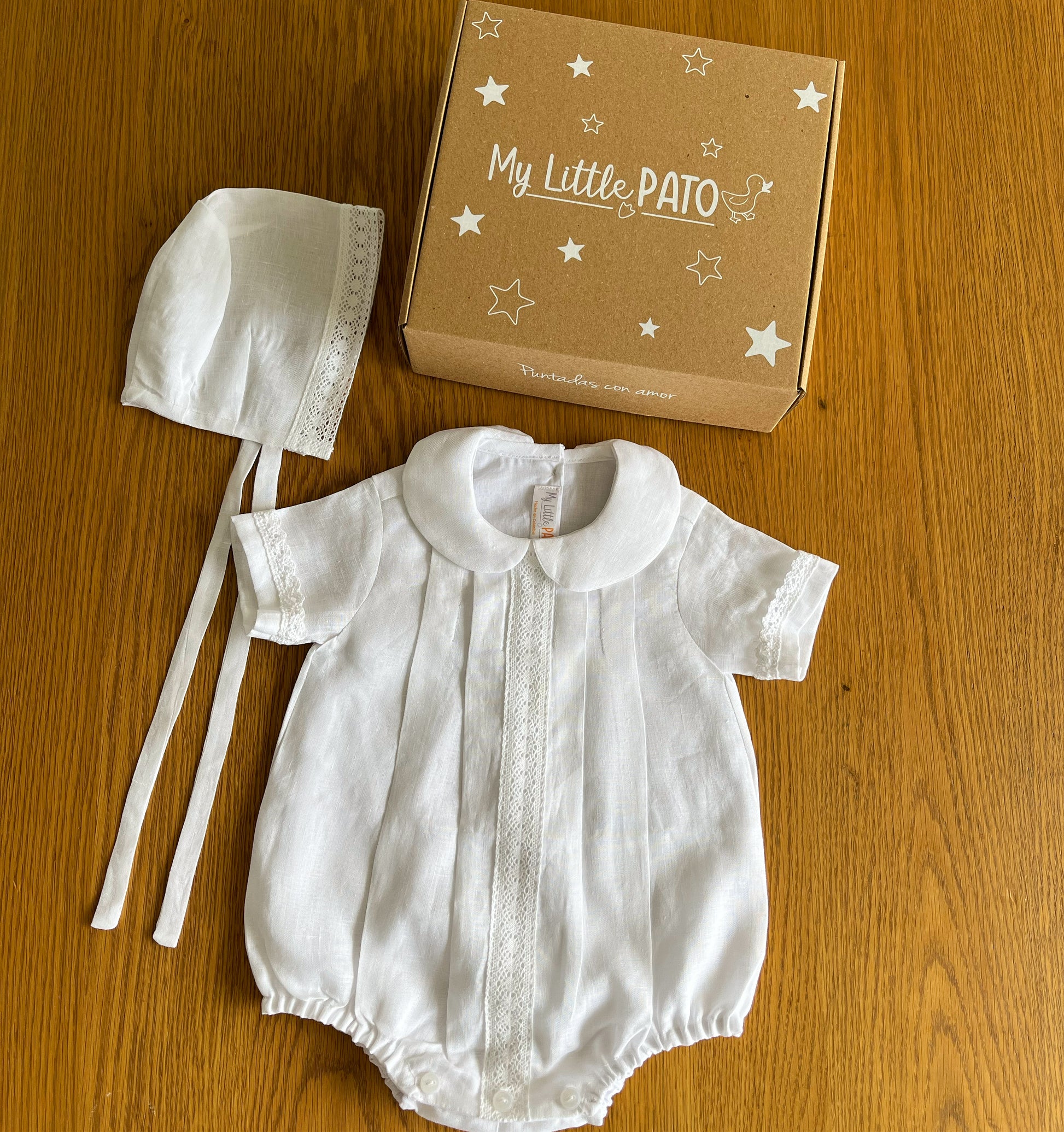 Pelele en lino Olán , totalmente forrado con detalles en alforzas y encaje bolillo .
