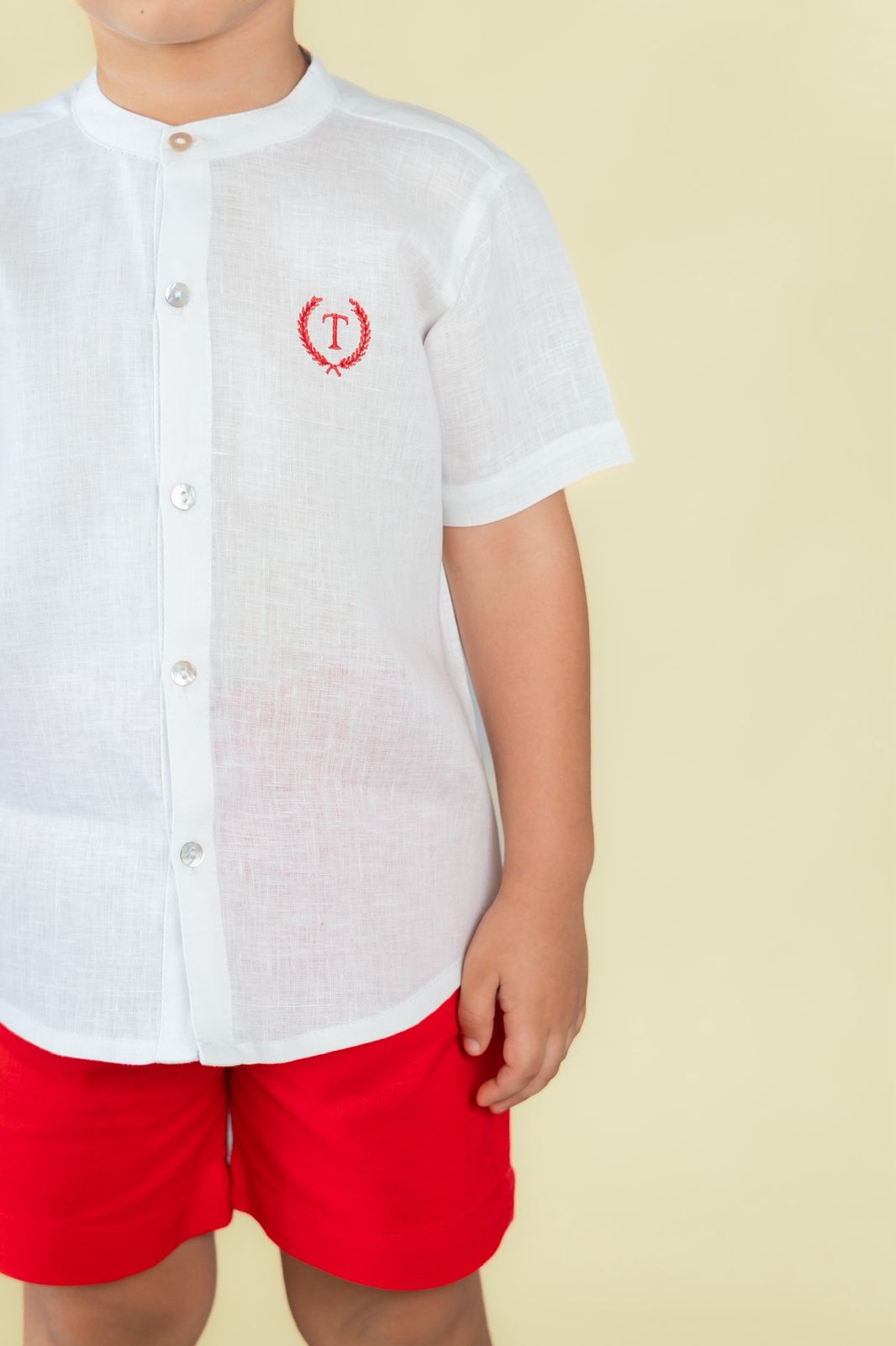 Set en lino bordado a máquina con la inicial del niño en espiga , bermuda totalmente forrada con bolsillos y elástico graduable en cintura.
