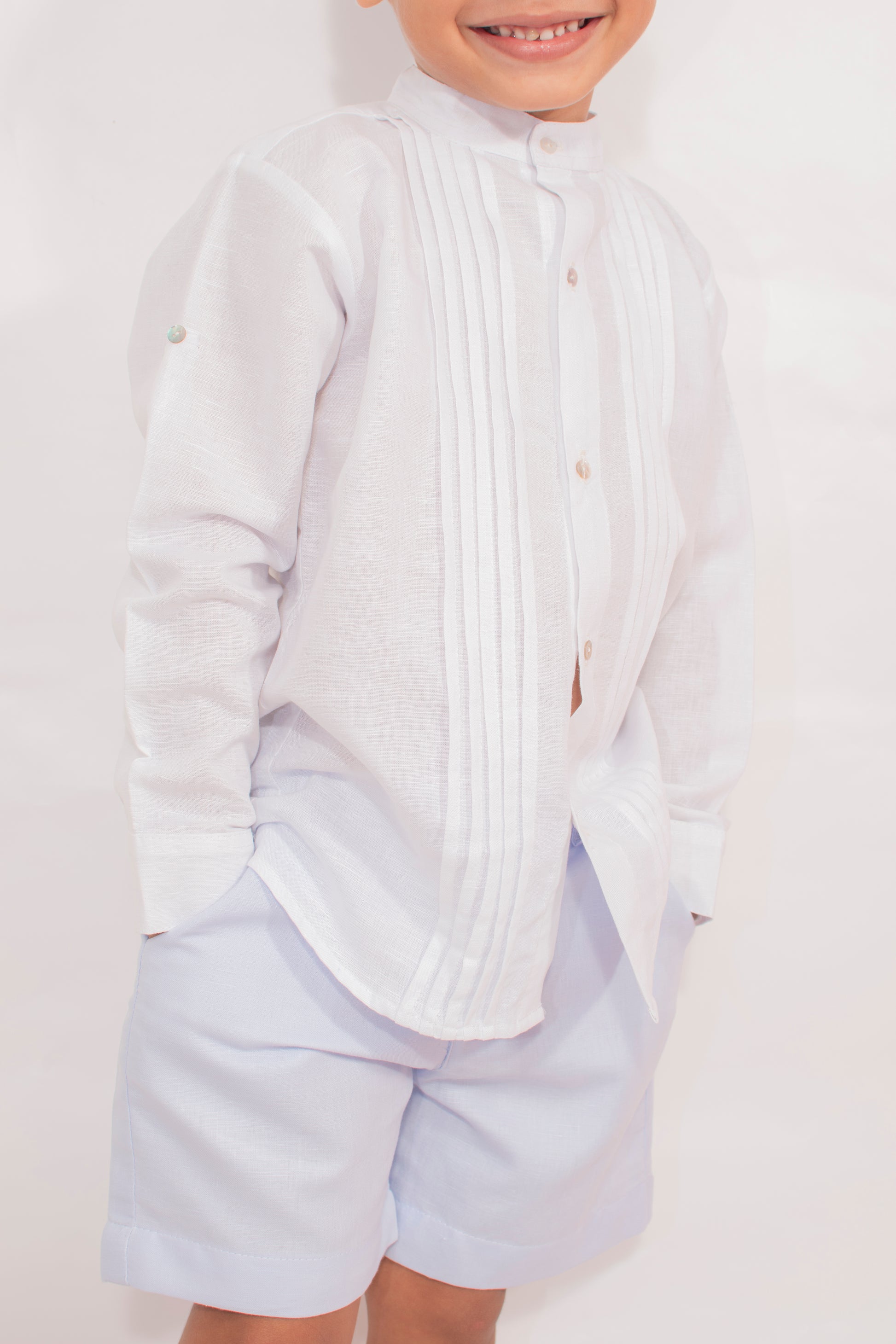 Camisa manga larga en lino con detalles en alforzas acompañada de bermuda totalmente forrada en algodón.